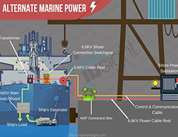 Alternate Maritime Power ¶Ç´Â AMP´Â À°»ó Àü·ÂÀ» ´ëü·Î »ç¿ëÇÏ¿© µðÁ© ¹ßÀü±â¿¡¼ ¹ß»ýÇÏ´Â ´ë±â ¿À¿°À» ÁÙÀÌ´Â µ¥ µµ¿òÀ̵Ǵ ¿À¿° ¹æÁö Á¶Ä¡ÀÔ´Ï´Ù. AMP´Â ¼±¹ÚÀÌ Ç×±¸¿¡¼ Á¤Áö ÇÒ ¶§ »ç¿ëµÇ¾î ¼±¹ÚÀÇ ¿£Áø (µðÁ©·Î ÀÛµ¿)À» ºÒÇÊ¿äÇÏ°Ô »ç¿ëÇÒ Çʿ䰡 ¾ø½À´Ï´Ù. ÀÌ´Â °á±¹ ¼±¹ÚÀÇ ¹èÃâ·®À» Å©°Ô ÁÙÀÌ´Â µ¥ µµ¿òÀ̵˴ϴÙ. ÀÌ °úÁ¤À» ³Ã°£ ´Ù¸²ÁúÀ̶ó°íµµÇÕ´Ï´Ù AMP/Cable reelÀº Ç×±¸¿¡ Á¤¹Ú ÇÒ ¶§ ¼±¹ÚÀ» À°»ó ±â¹Ý Àü¿ø¿¡ ¿¬°áÇÏ´Â Àü±â ÄÉÀ̺íÀ» ó¸®Çϵµ·Ï ¼³°èµÈ ¼±¹Ú ÀåÂø ¸±ÀÔ´Ï´Ù. ÄÉÀÌºí ¸±Àº ¹× Àü·Â ¹× Åë½ÅÀ»À§ÇÑ µµ°ü ¿ªÇÒÀ»ÇÕ´Ï´Ù.